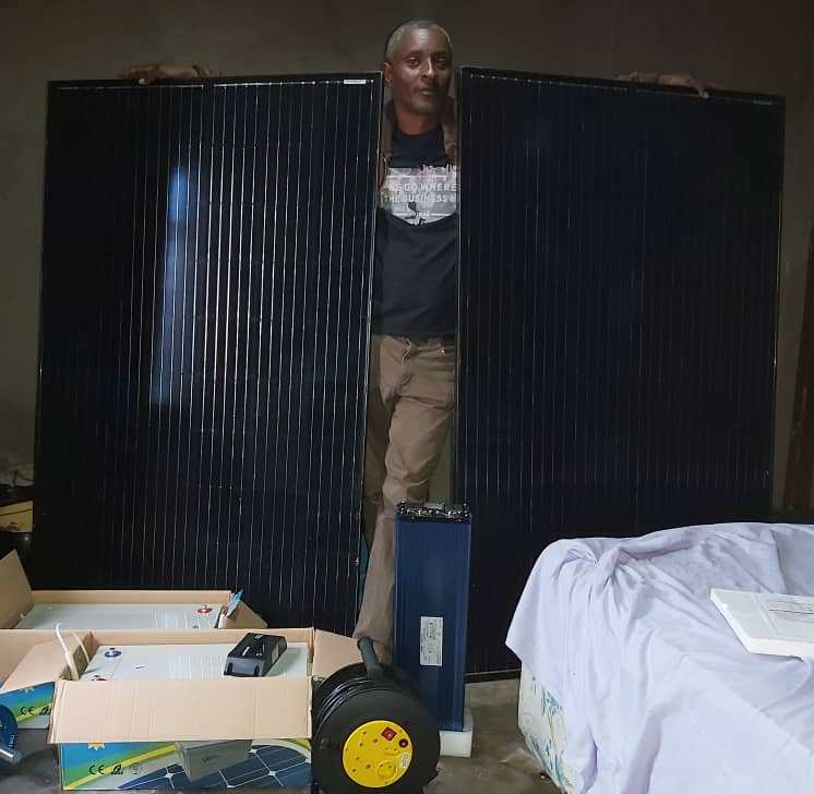 Evans managed to buy a 6KVA/4000W Solar Kit including 4x batteries, 1x inverter and 2x 330W solar panels, which will be installed shortly onsite.