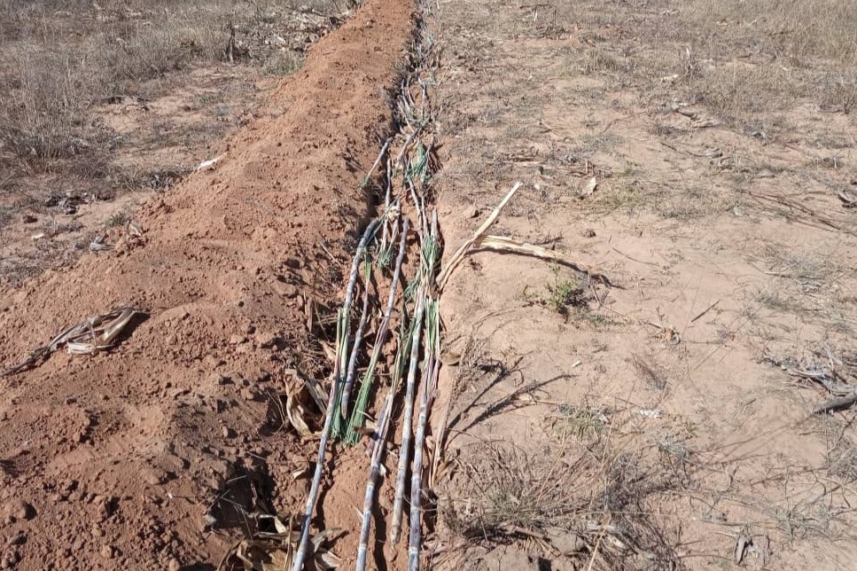 We have also purchased sugar cane, what we are going to use for windbreak. We were digging trenches and we put maize stalks, manure and compost in. After we laid the sugarcane in these trenches and cover them with soil and then water them. They will develop roots in 5-7 days.